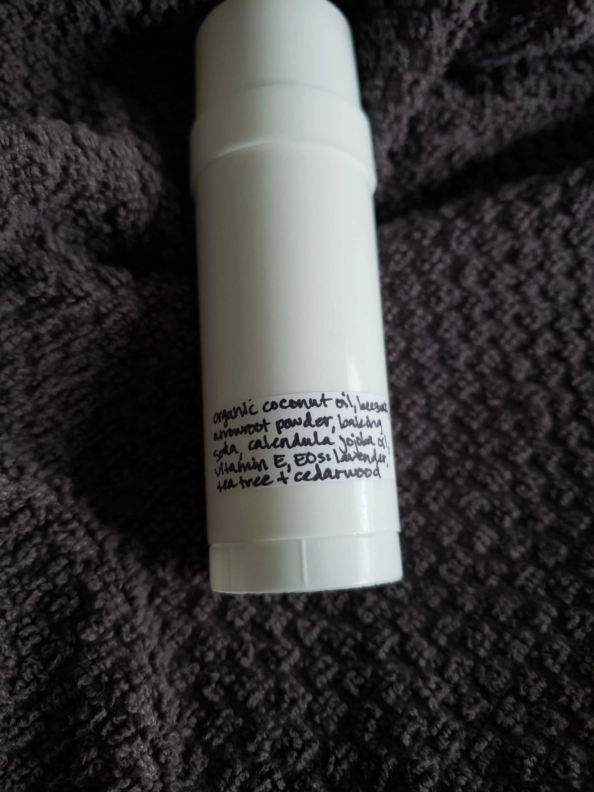 made with: organic unrefined coconut oil, beeswax, arrowroot powder, baking soda, calendula infused jojoba oil, vitamin E, + essential oils of lavender, tea tree, + cedarwood
